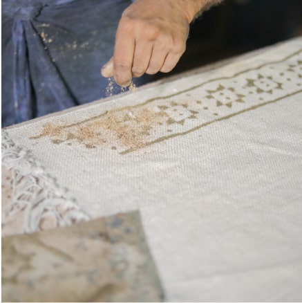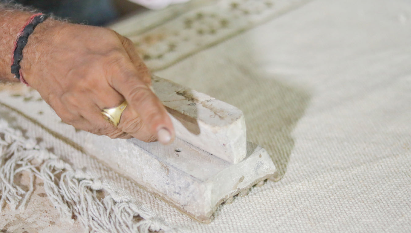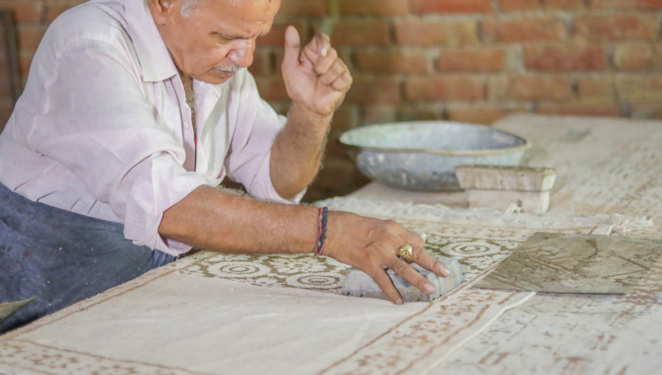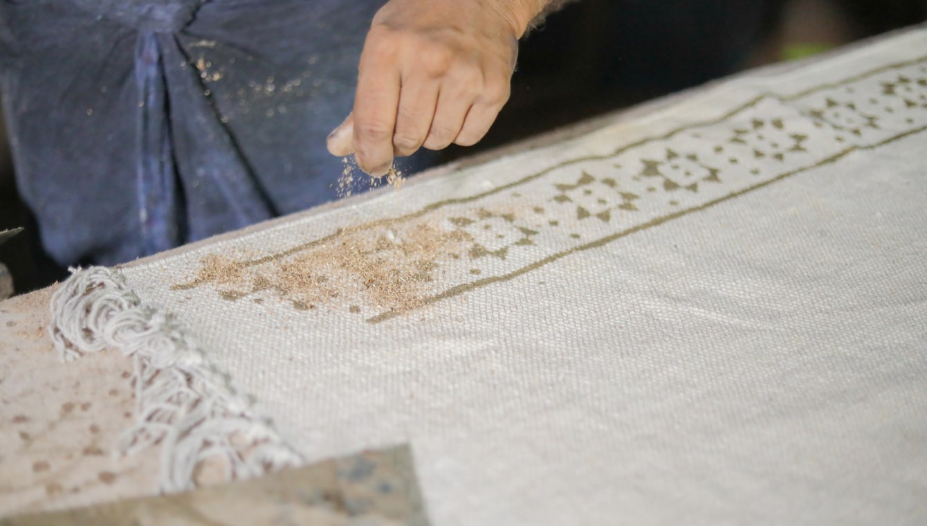 En règle générale, un tampon de test est placé sur un petit morceau de tissu pour garantir que le motif du bloc est tel qu'il devrait être. Lorsqu'il est équilibré et que le motif est perfectionné, l'artisan passe au tissu final et tamponne soigneusement les motifs avec la paume de la main, en appliquant juste ce qu'il faut de force sur le dessus du bloc de bois.