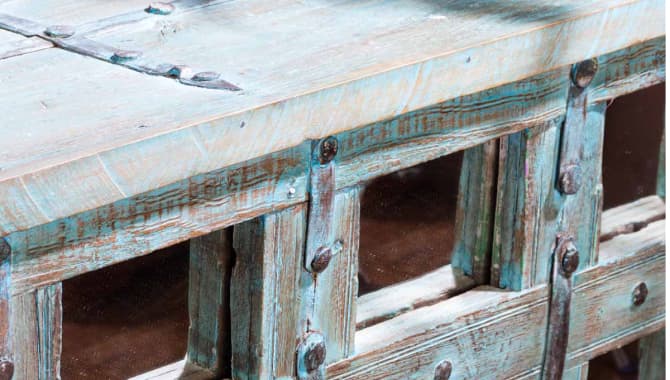Le bois vieilli peut généralement être fabriqué à partir de bois « neuf », mais chez Mytri Designs, nous avons utilisé du bois récupéré à partir de produits recyclés ou mis au rebut avant de vieillir la finition.
